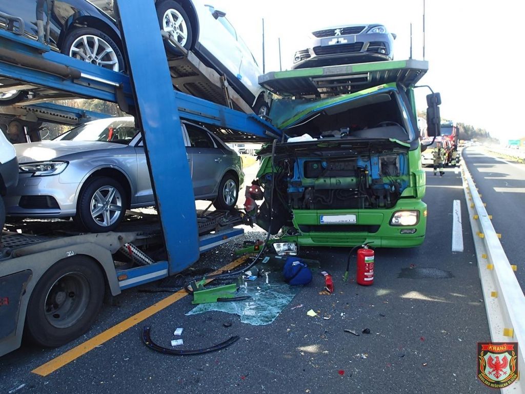 V četrtek ob 13.31 sta na avtocesti Naklo–Kranj zahod v smeri proti Ljubljani trčili tovorni vozili tujih prevoznikov za prevoz vozil. Zaradi nesreče je bila na tem delu avtocesta več ur zaprta. Vzrok naleta je bila prevelika hitrost. V prometni nesreči je nastala večja materialna škoda.