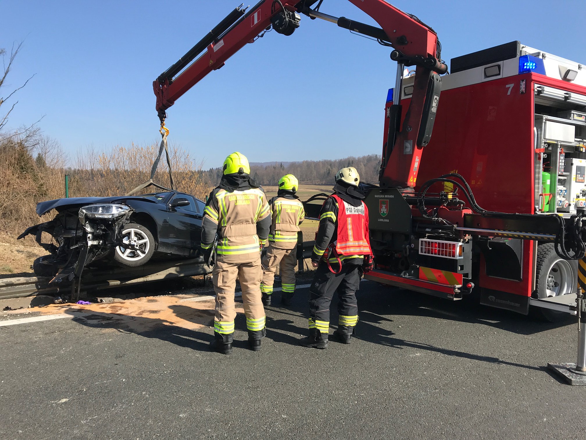 Uprava za zaščito in reševanje je zapisala, da se je ob 17.06 na avtocesti pri izvozu Trebnje–vzhod, smer proti Ljubljani v občini Trebnje, osebno vozilo zaletelo v odbojno ograjo in obstalo na prehitevalnem pasu. Gasilci GRC Novo mesto in PGD Trebnje so zavarovali mesto dogodka, odmaknili vozilo na odstavni pas in odklopili akumulator.