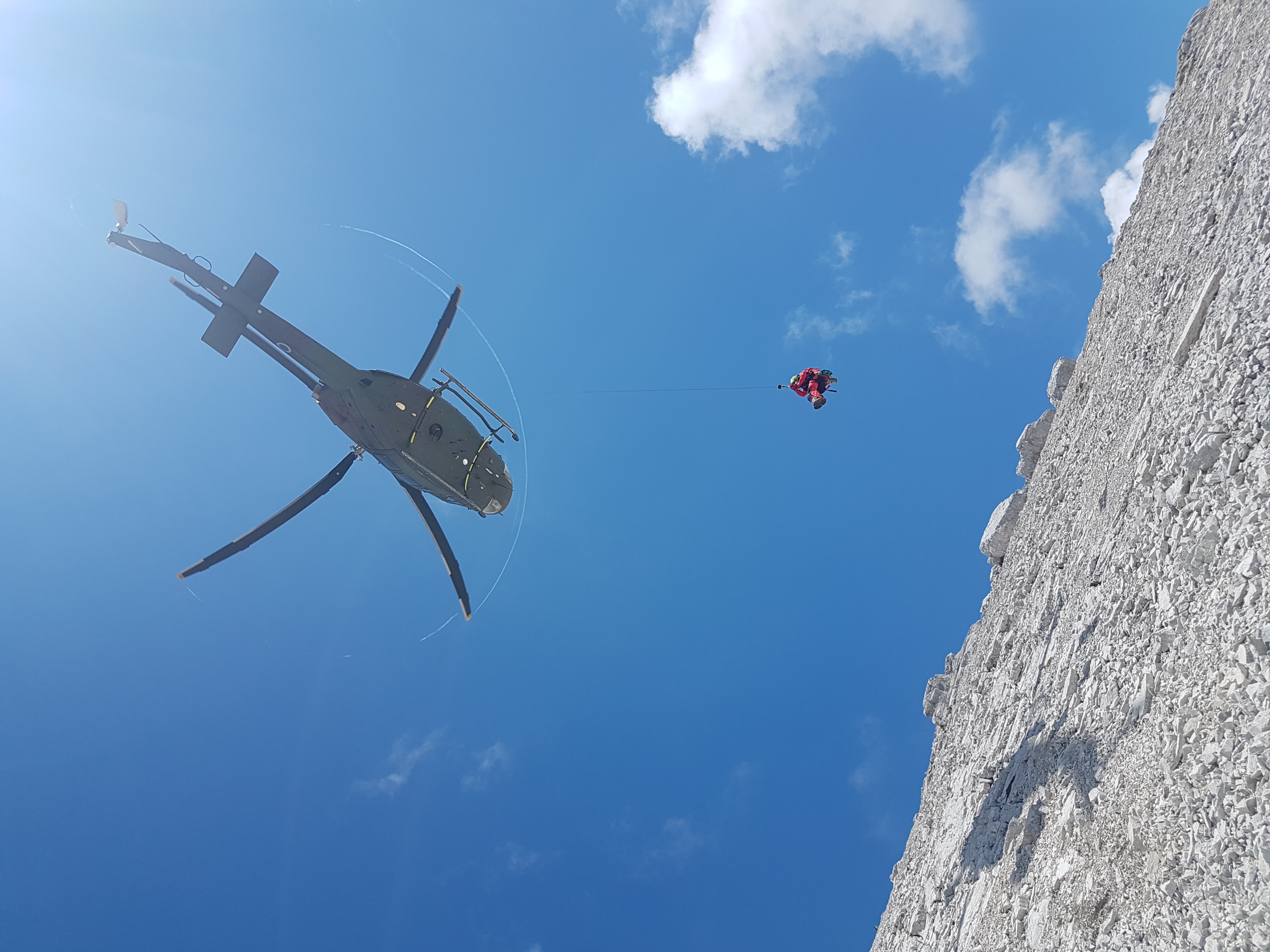 Posredujejo skupaj gorski reševalci GRS Rateče in posadka helikopterja Slovenske vojske v spremstvu dežurne ekipe GRS na Brniku s helikopterjem.