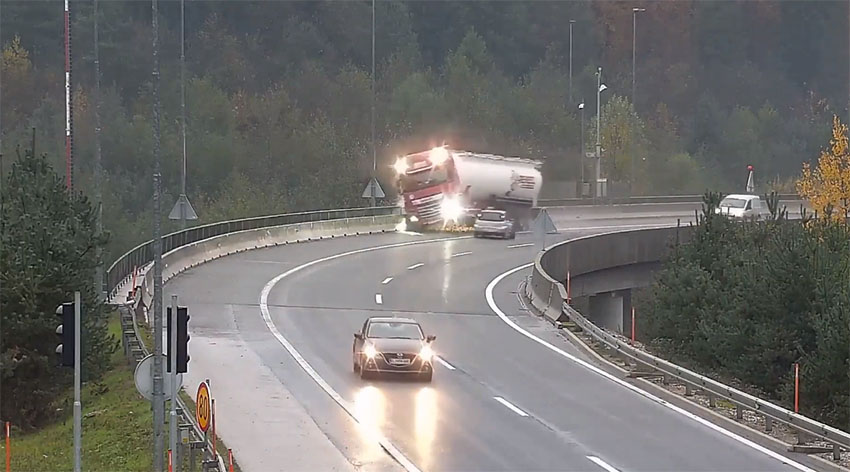Spomnimo, 40-letni slovenski voznik osebnega vozila opel corsa zaradi neprilagojene hitrosti v ovinku zapeljal desno in trčil v priklopno vozilo. Tovorno vozilo je zaneslo desno in z vozišča, kjer je prebilo varovalno ograjo in padlo z viadukta v globino približno 20 metrov. Voznik osebnega vozila v nesreči ni bil poškodovan. Nastala je večja materialna škoda, v cisterni pa ni bilo nevarnih snovi. Poškodovano je bilo še eno vozilo, na katero so padli deli cestne infrastrukture.
