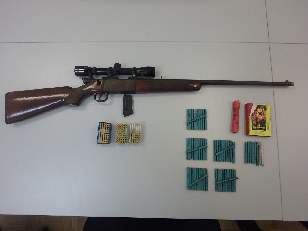 Med hišno preiskavo so policisti našli in zasegli malokalibersko puško neznane znamke z nameščenim daljnogledom, pripadajočih 128 nabojev in 63 različnih petard. Zasegli so mu tudi manjšo količino posušene zelene rastline, za katero sumijo, da je prepovedana droga konoplja.