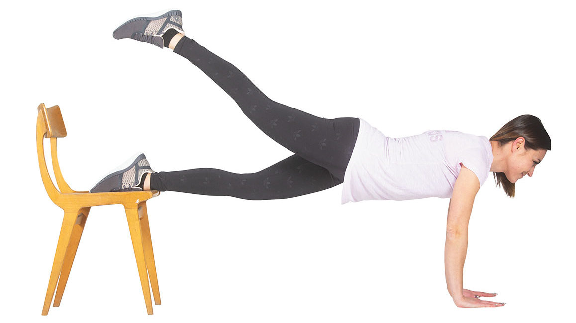 Tokrat bomo skleco malce otežili. Z nogami se opremo na sedalo stola. Dlani položimo na tla in izvajamo skleco. Ne pozabimo, da moramo stisniti trebušni del.