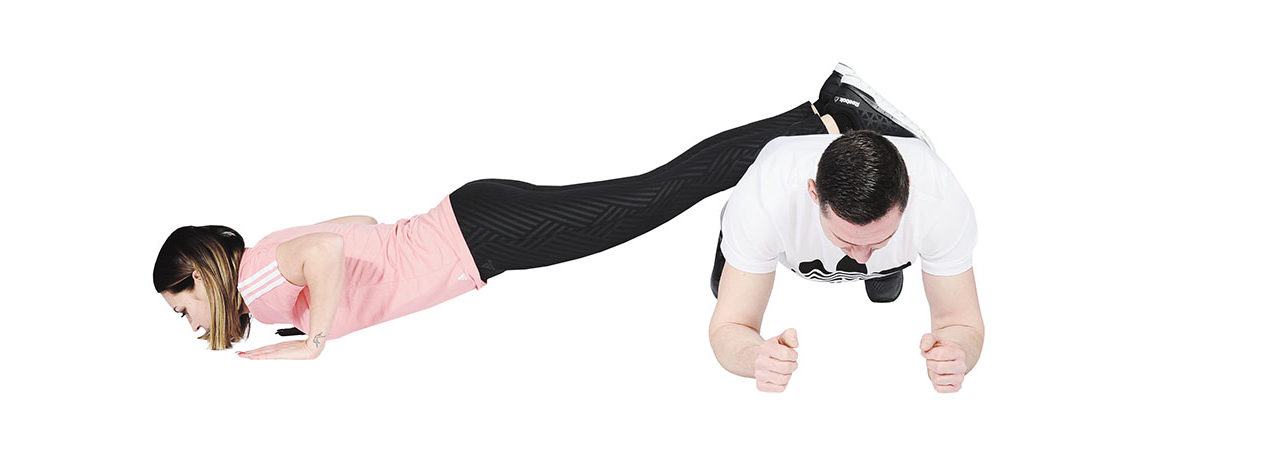 Pomočnik, medtem ko služi kot opora partnerju, izvaja »plank« oziroma most. Vadeči, usmerjen pravokotno na partnerja in s stopali na njegovem hrbtu, krepi iztegovalke komolcev in ramen ter upogibovalke ramen, medtem ko dela sklece.