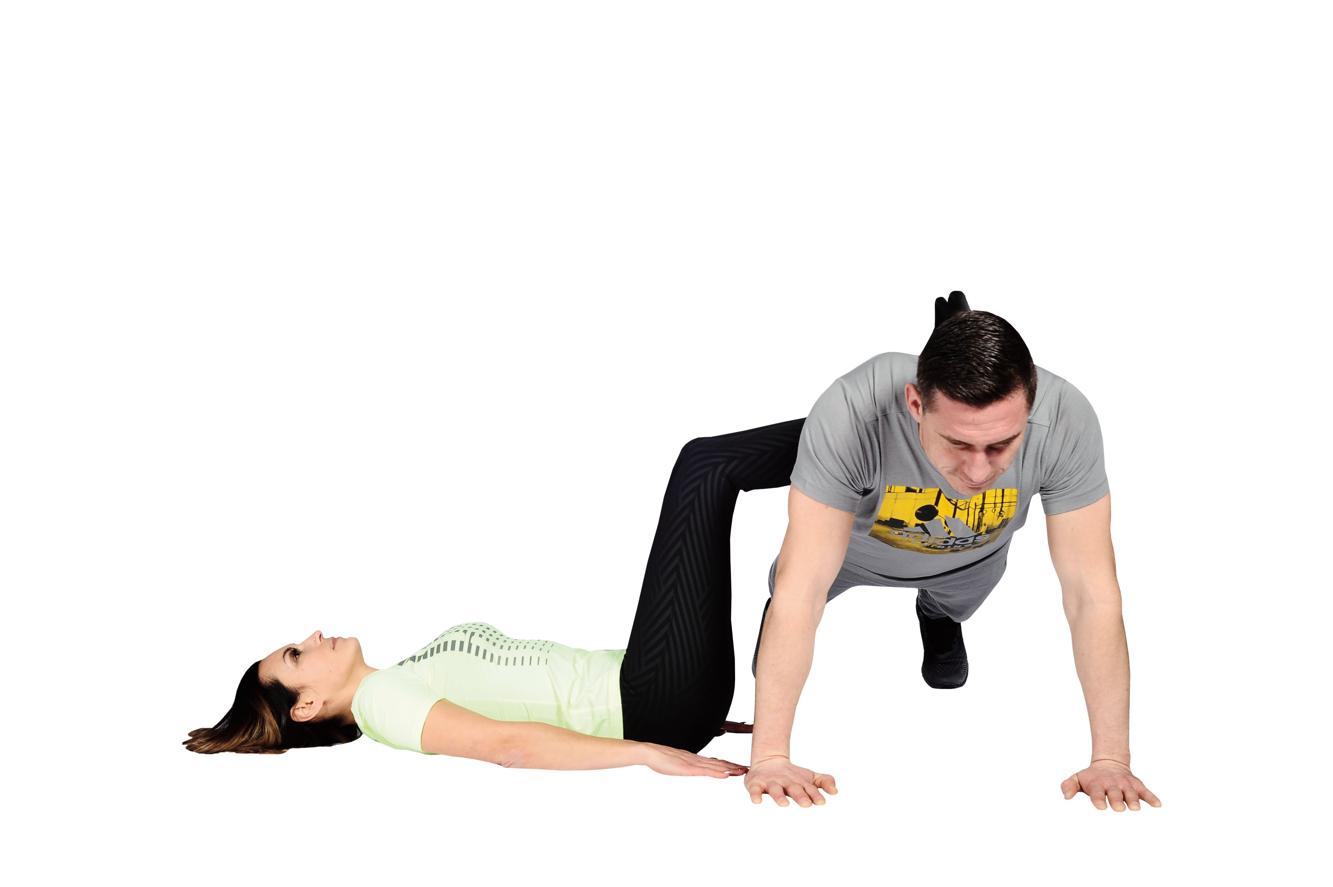 Vadeči leži na tleh, s pokrčenimi nogami in meči na hrbtu partnerja. Pomočnik je oprt na roke, z ravnim hrbtom. Z dvigom bokov in spustom v začetni položaj, vadeči krepi iztegovalke kolkov in upogibovalke kolen.