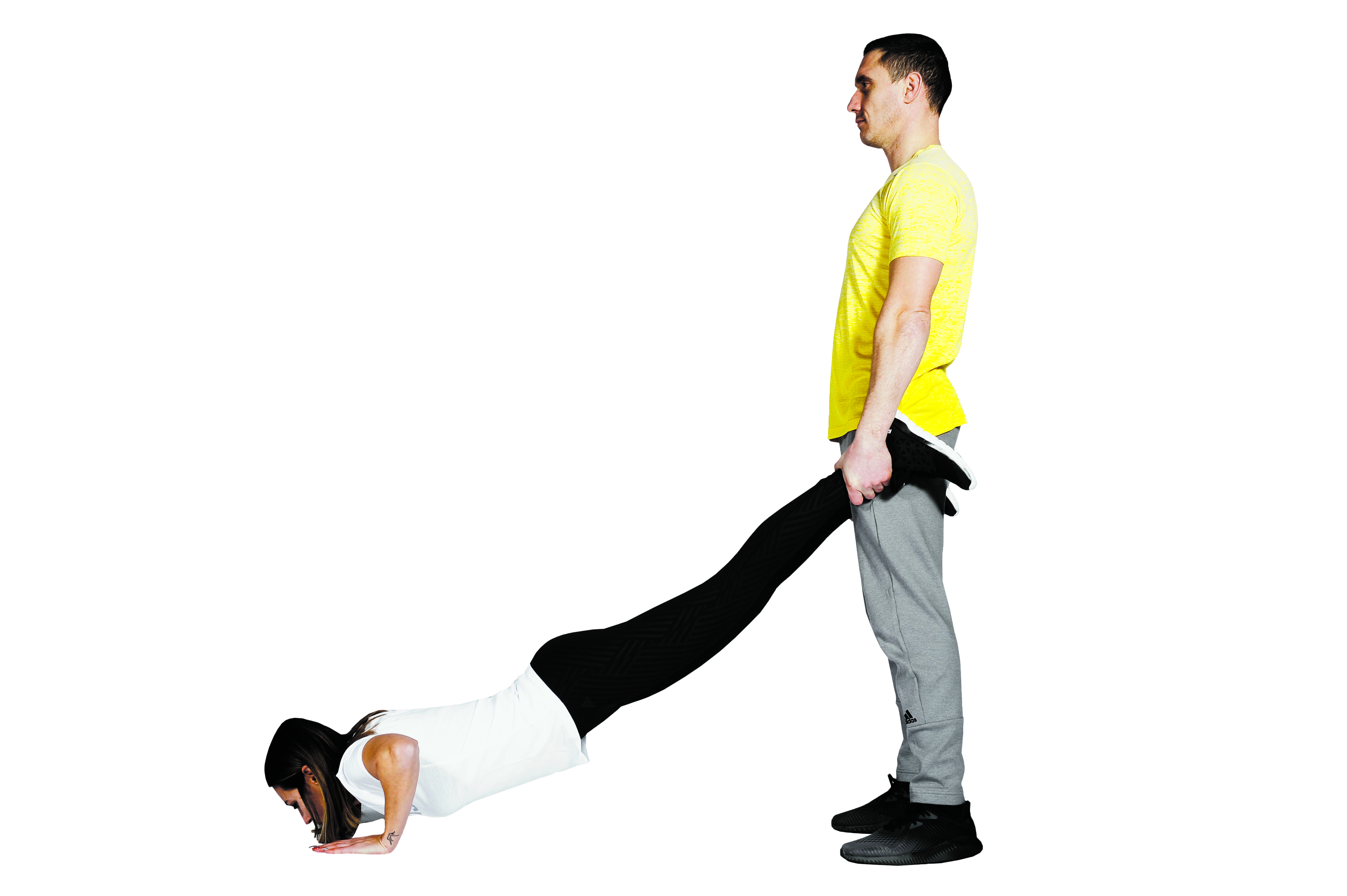 Pomočnik stoji za partnerjem z rahlo razkoračenimi nogami, med tem ko ga drži za gležnje. Vadeči, ki izvaja sklece pazi, da ima napete trebušne mišice in ravno telo. Krepi iztegovalke komolcev ter ramen in upogibovalke ramen.