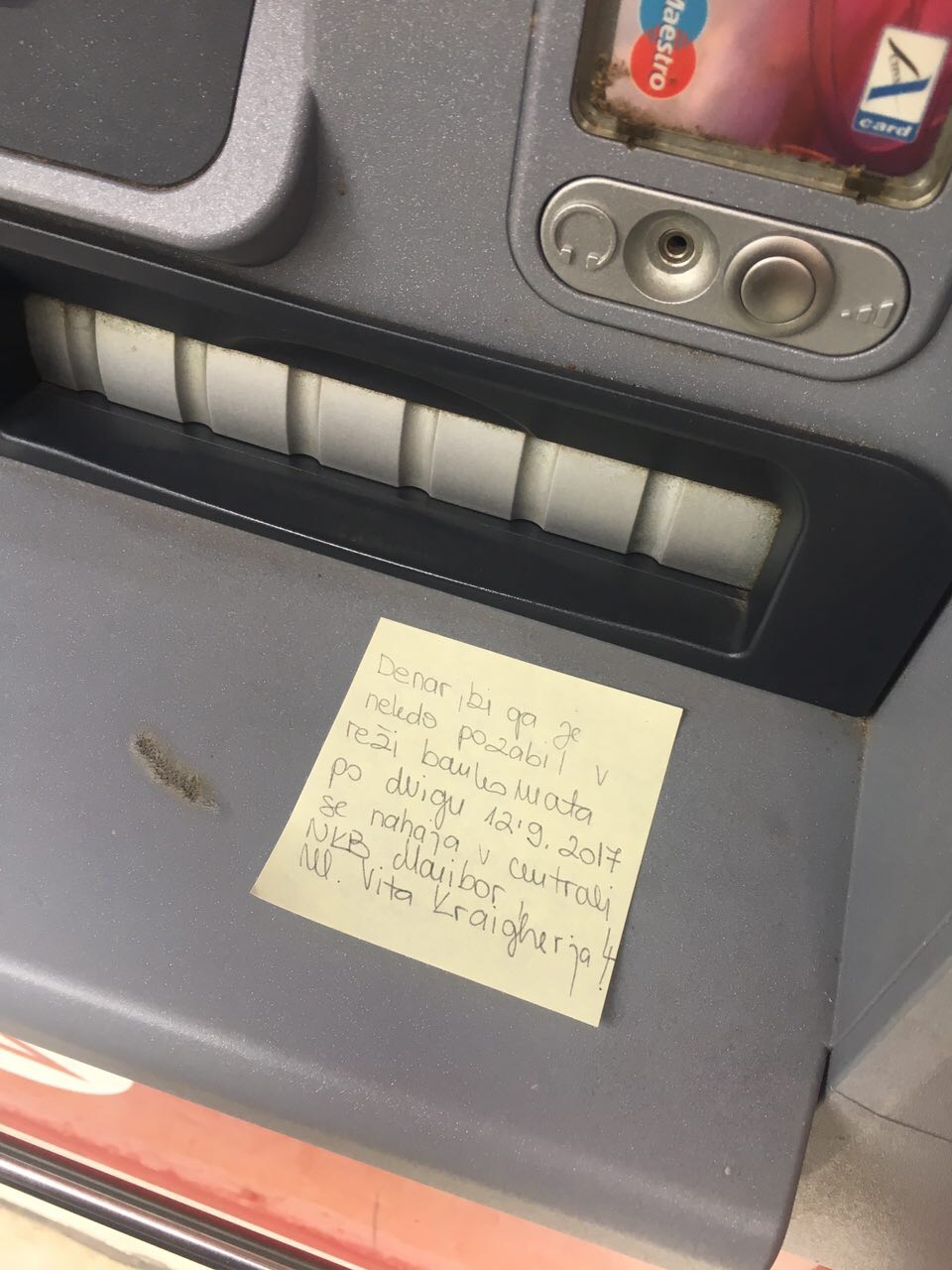 »Denar, ki ga je nekdo pozabil v reži bankomata po dvigu 12.9. 2017 se nahaja v centrali NKB Maribor, Ul. Vita Kraigherja 4,« se je glasil zapis.