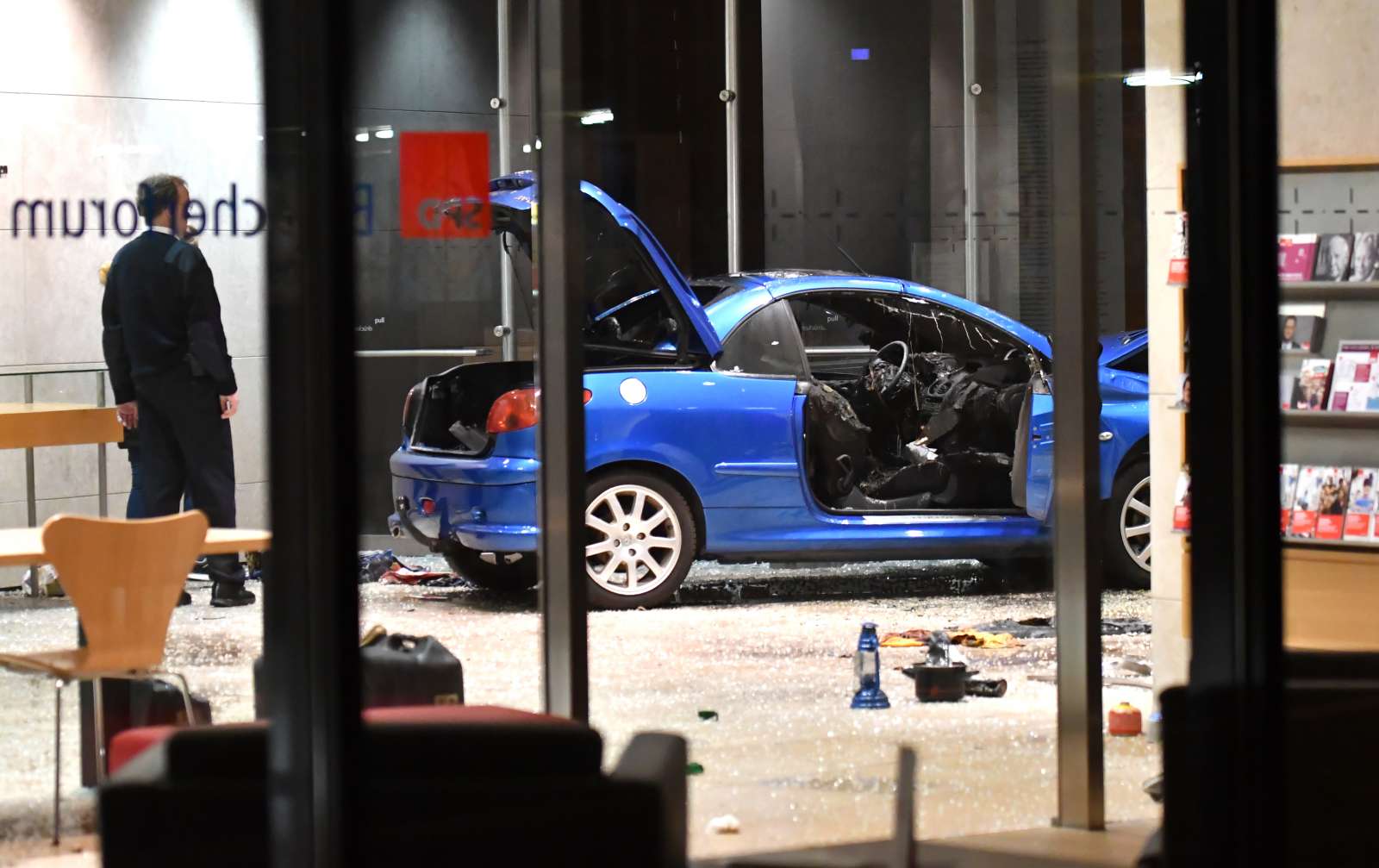 Po navedbah policije je z avtomobilom prebil stekleno pročelje na vhodu v poslopje in nato obstal. V vozilu je izbruhnil ogenj, ki so ga takoj pogasile škropilnice v poslopju. Na fotografijah je videti ožgana mesta na avtomobilu in tudi stopljen del vrat.