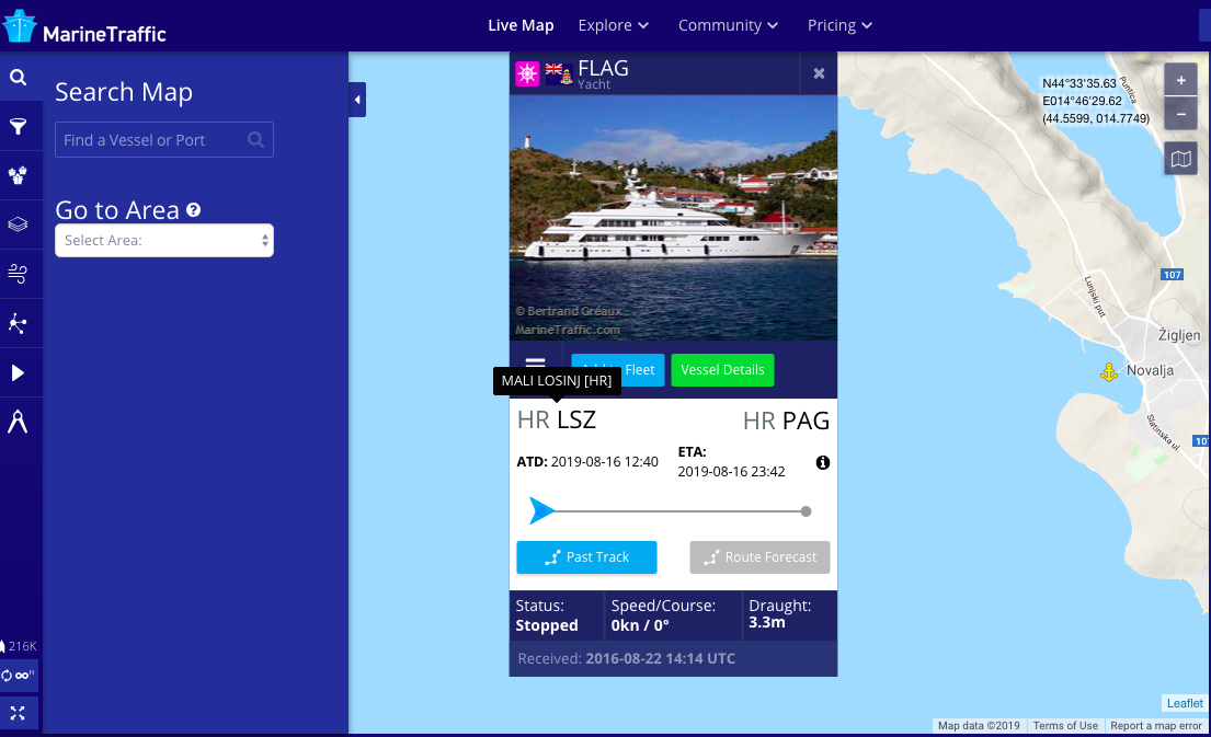 Portal MarineTraffic nam pokaže koordinate, kjer je svojo Zastavo parkiral sloviti kreator.