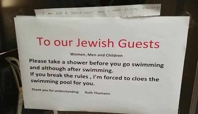 Novica o neprimernih napisih se je razširila, ko je eden od ogorčenih gostov na Facebooku objavil fotografijo napisa ob bazenu hotela Paradies. »Naše judovske goste – ženske, moške in otroke – naprošamo, naj se pred uporabo bazena oprhajo. V primeru kršitve pravila bomo prisiljeni (zapreti) bazen za vas,« je pisalo na napisu ob bazenu.
